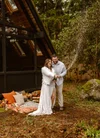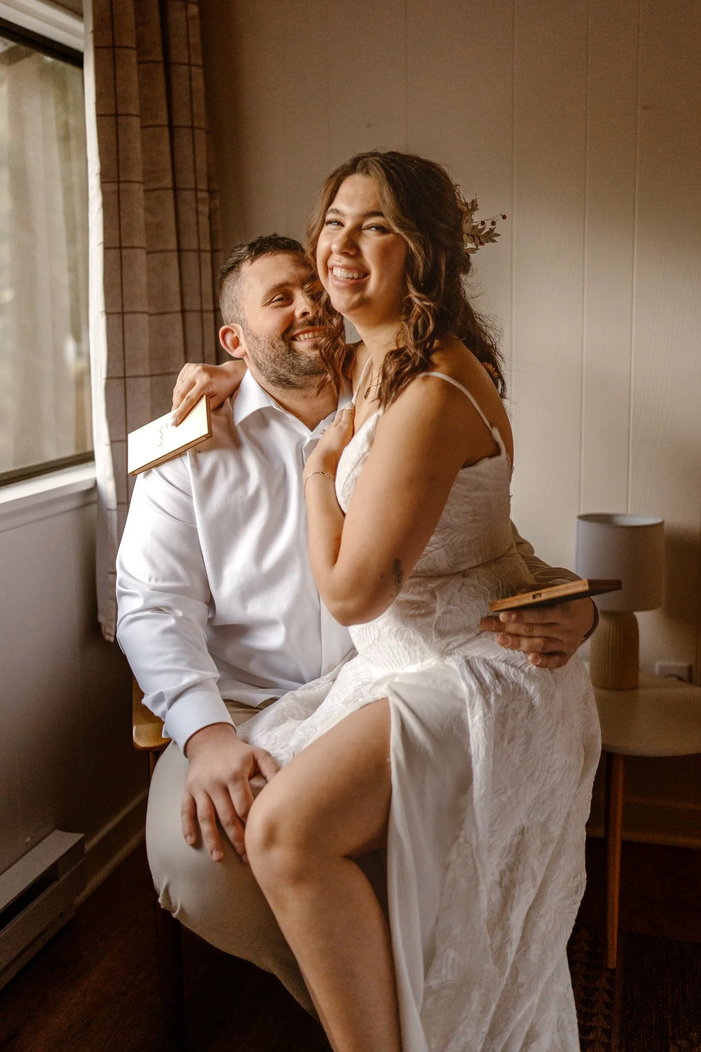 PNW Washington Elopement Couple Sitting Together with Veiled Bride in Natural Makeup and Red Lip